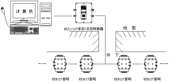 装置连接由调度室广播站或MP3输出音频信号,由KXJ1/127非安/本安转换器完成非安到本安的转换,通过信号电缆或通讯电缆传输到井下各个广播音箱。若距离较远,可增加一级(KXJ1/127)转换器,来完成煤矿广播和音乐播放。