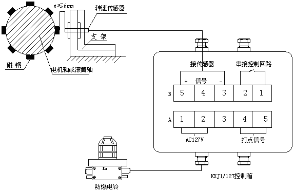 1、将闭锁装置悬挂在绞车操作台附近的巷道壁上,转速传感器安装在滚筒或电机轴一侧,与转速传感器配合使用的磁钢粘贴在滚筒轴或电机轴上(注意磁钢的工作面向外),安装方法见图: